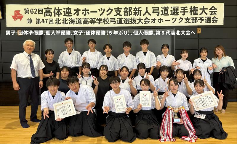 令和7年9月11日~12日、北見市武道館において、高体連オホーツク支部の新人戦が行われました。本校からは男女8名ずつが出場した個人戦では、80人出場した男子の中で、菅原選手(2年次)が見事準優勝に入賞しました。射詰8本目で決まる熱戦でした。89名出場した女子では、伊藤結菜選手(2年次)が2射めを1人だけ的中させ、見事優勝を果たしました。今橋選手(2年次)も代表決定射詰に健闘し、第9代表の座を射止め、3人が北北海道大会への出場権を獲得しました。