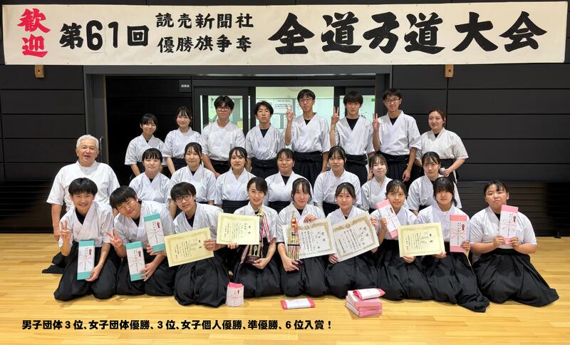 令和7年9月28日、北見市武道館にて第61回読売新聞社優勝旗争奪全道弓道大会が開催されました。男子団体は17チーム中、24射14中で3位に入賞、女子団体は26チーム中、24射15中でAチームが優勝、Bチームが11中で3位に入賞しました。また、個人戦では女子Aチームの今橋選手(2年)が6中で単独優勝、5中の伊藤結菜選手(2年)が4人で2~5位の遠近競射で準優勝、4中の和知選手(1年)も7人で6~7位の遠近競射で6位に入賞を果たしました。10月中旬にある北北海道選抜大会の前哨戦と捉えていた大会で、入賞を決めたので、今後が楽しみです。その大会まで2週間あるので、更に調整し、良い結果を報告できるよう頑張ってほしいです。(文責:顧問細川)