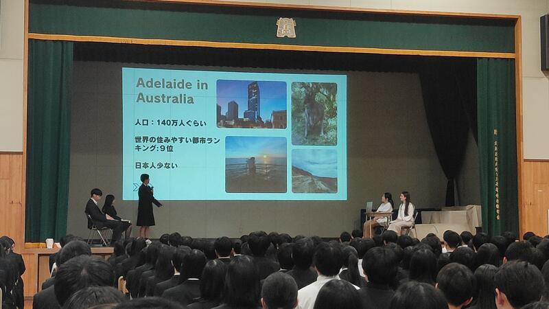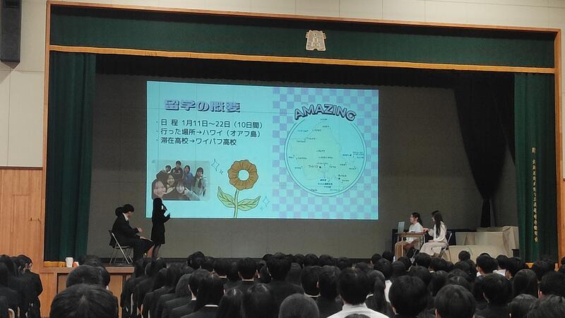 1・2年次生から各1名、ハワイとオーストラリアでの留学経験を発表しました。留学期間や現地の学校生活、実際に体験した文化の違いなど、スライドを用いて説明しました。同じ学校・クラスにいる生徒の発表であるため、聴取していた生徒は一層興味を示していました。